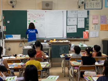 9月11日(金)3時間目、2年1組は算数で「ブロックをどのように並べると、かけ算をあらわせるか考えよう」というめあてで学習していました。一人ずつ考えたあと、発表ボードに書いて5人の考えを黒板に貼り、みんなでそれについて考えました。