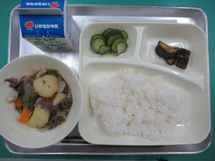 献立:肉じゃが、焼きなすのみそだれかけ、あっさりきゅうり、ごはん、牛乳