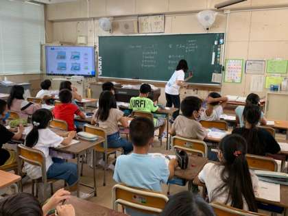 9月16日(水)1時間目、4年1組は外国語活動で“How many 〇〇s?”を学習していました。映像を見ながら英語を聞いて答えを考えるという難しいことをしていました。答も英語で言うように先生から言われていました。