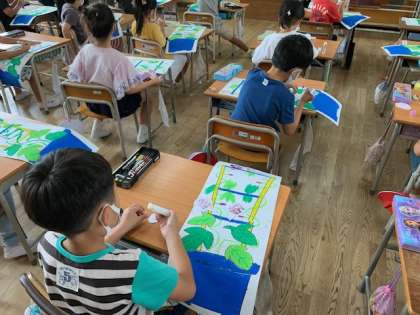 9月16日(水)3時間目、1年1組は生活科でアサガオの絵を仕上げていました。よく見ると花が実際の花の色のようでした。子どもに聞くとアサガオの花を使ってたたき染めをしたとのことでした。
