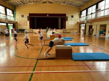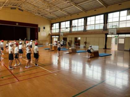 9月16日(水)4時間目、3年2組は体育館で体育をしていました。跳び箱の開脚跳びを練習していました。