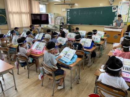 9月17日(木)5時間目、1年1組は音楽で鍵盤ハーモニカの練習をしていました。「どれみで あいさつ」という曲で歌うところから練習していました。上手に弾けたかな?