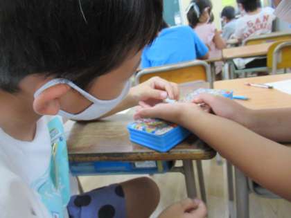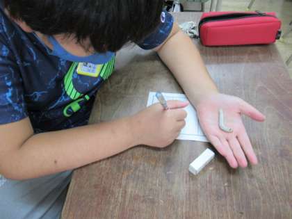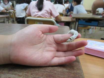 3年2組の教室に入ると、子どもたちの机の上や、手のひらには「蚕」がいました。