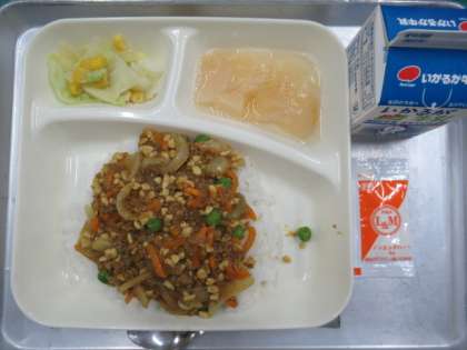 献立:大豆入りキーマカレーライス(米粉)、キャベツとコーンのサラダ(ノンエッグドレッシング)、白桃(缶づめ)、牛乳