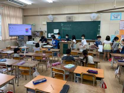 9月25日(金)4時間目、2年2組の教室の入り口に「2×6」がぶらさがっていました。教室に入ると子どもたちが並んでおり、先生に九九を聞いてもらっているようでした。全員2の段を合格できたかな?