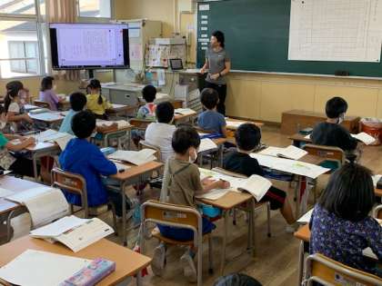 10月2日(金)1時間目、1年1組は国語で「ようすを つたえる 文しょうを かく。」を学習していました。子どもたちが書いた「はっけんメモ」をもとに、文章を書くようです。場面が変わると一マス下げる等を学んでいました。