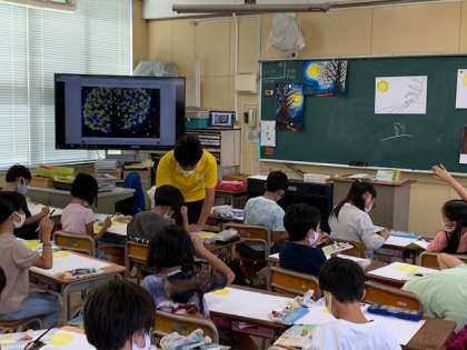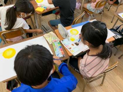 10月2日(金)2時間目、3年2組は図工でお話の絵を描いていました。お話は「モチモチの木」で月の感じはみんな同じでした。木の色を茶色に黒を混ぜたりして工夫していました。