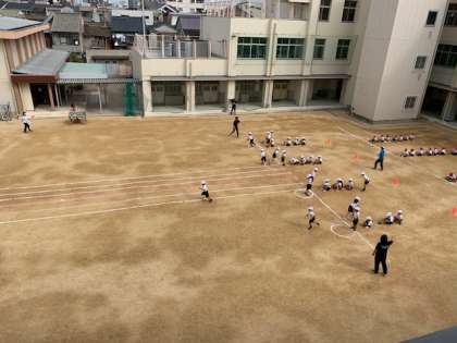 10月5日(月)2時間目、1年生は体育で徒競走と折り返しリレーをしていました。徒競走では座った状態からスタートする等いつもと様子が違っていました。