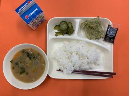10月5日(月)お好み焼き、とん汁、きゅうりのうめふうみ、ごはん、牛乳
