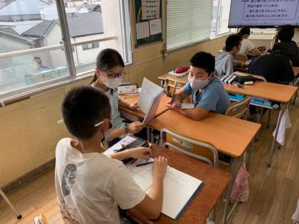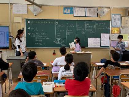 10月5日(月)5時間目、6年2組は算数で比の学習をしていました。比を使った問題の解き方を考えました。いくつかの解き方が出され、それぞれが解いていきました。これまでに学習してきた「等しい比の関係」を使うと解決できることがわかりました。