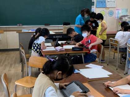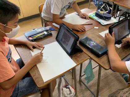 10月6日(火)5時間目、5年1組は図工で昨日に続いてお話の絵に挑戦していました。今日はタブレットが動いたようで、絵本の絵を参考にしながら下絵を描き始める子がいました。