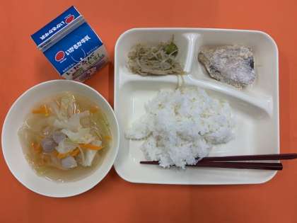10月7日(水)かつおのマリネ(ノンエッグドレッシング)、ウインナーと野菜のスープ、もやしとピーマンのソテー、ごはん、牛乳