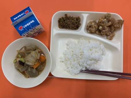 10月14日(水)鶏肉のたつたあげ、あつあげとやさいの煮物、おかかなっぱ、ごはん、牛乳