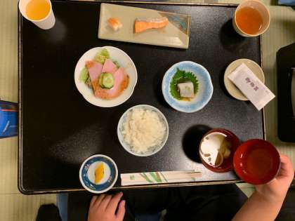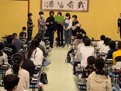 朝食です。コロナ対策で、同じ方向を向いて食べます。ご飯をよそっていただいたり、お茶を入れていただいたりした時に、「ありがとうございます。」を言える人が増えました。