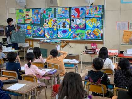10月20日(火)4時間目、2年2組は図工で「ふしぎなたまご」の作品を黒板に貼り、鑑賞をしていました。上手にできましたね。