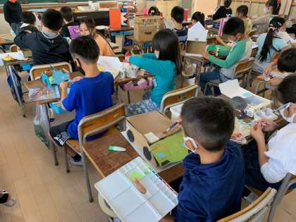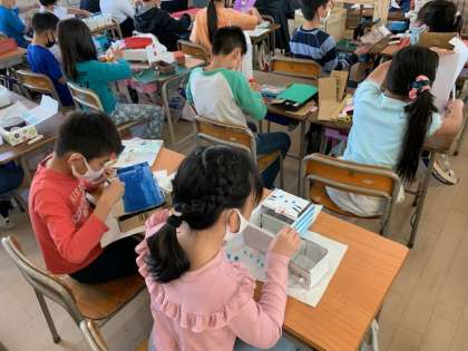 10月20日(火)5時間目、4年1組は図工でアイデアボックスを作っていました。いろいろな形や模様があり楽しい箱ができつつありました。