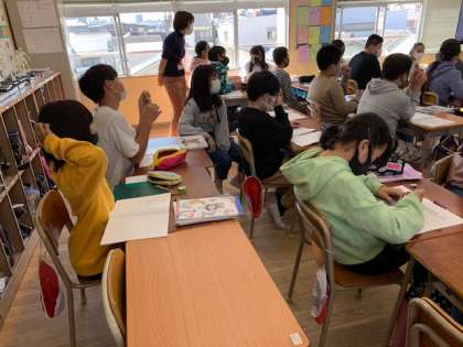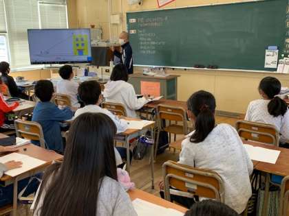 10月21日(水)3時間目、6年1組は算数で「実際に測ることのできない長さを求める方法を考えよう」というめあてでビルの高さを求める問題を考えていました。「見通し」を近くの人と相談していました。後から先生に聞きますと、子どもたちは縮尺の考え方を使って解いていったそうです。