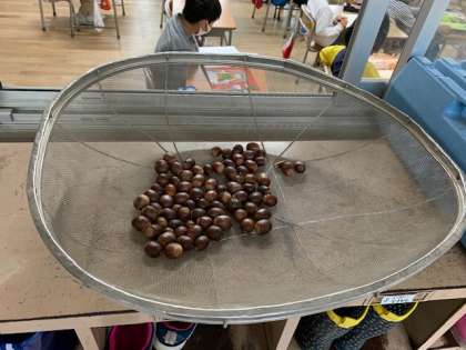 10月23日(金)朝読タイムの時間に1年1組の廊下でどんぐりを見つけました。このどんぐりはどうしたんだろうと気になりました。また、このどんぐりを使って遊ぶのかなあと思いました。これだけのどんぐりだったら1年生全員が遊べないしなあ・・・。どうなっていくのか楽しみです。