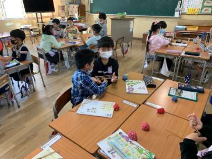 10月27日(火)1時間目、1年2組は生活科で「むかしあそび」のあやとりをしていました。私もやってみましたが、何年もしていなかったので、やり方を忘れていました。今度、子どもたちに教えてもらおうと思います。机の上におてだまがあったので、この後遊んだことでしょう。