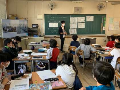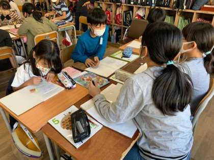 10月27日(火)5時間目、5年2組は算数で「単位量あたりの大きさ」を学習しました。今日は、こみぐあいを比べる便利な方法を見つける学習です。見通しを持って、各自で考えた後、班で話し合いました。シート1枚当たりの人数を求めた班と1人あたりのシートの枚数を求める班にわかれました。多くの班がシート1枚当たりの人数を求めていました。