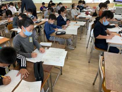 10月28日(水)2時間目、3年1組は国語で、みんな一生懸命文を書いていました。作文の学習だと思ったら、みんなの前で話すために、文をまとめているようです。どんなスピーチになるのでしょうか。