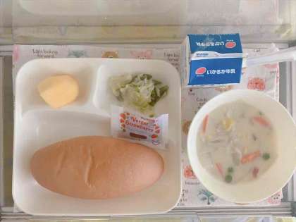 【コーンクリームシチュー[米粉]、キャベツとさんどまめのサラダ、かき(平核無柿)、コッペパン、いちごジャム、牛乳】