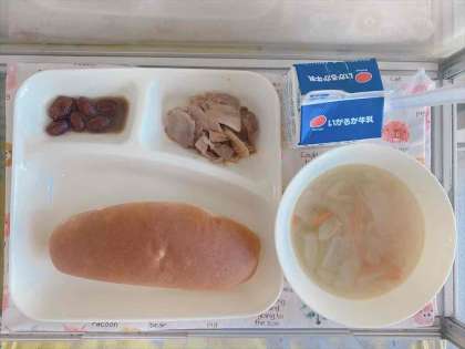 【豚肉のデミグラスソース、スープ、うずら豆のグラッセ、おさつパン、牛乳】