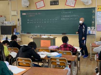 11月9日(月)1時間目、6年1組は算数で「反比例をグラフに表し、気づいたことを発表しよう」というめあてで学習していました。反比例のグラフの書き方を教わっているところでした。