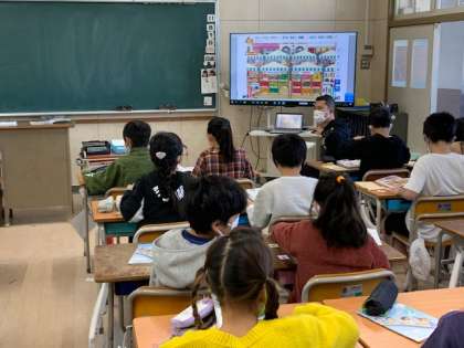 11月9日(月)1時間目、4年2組は外国語活動でフルーツの名前を英語で聞く練習をしていました。