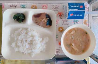 【なまりぶしのしょうが煮、みそ汁、ほうれんそうのおひたし、ごはん、牛乳】