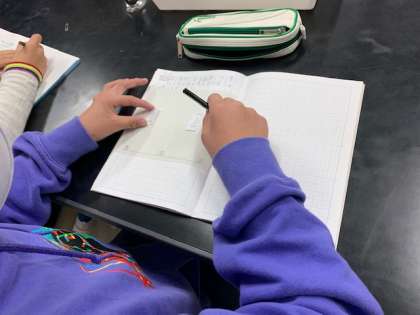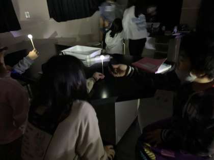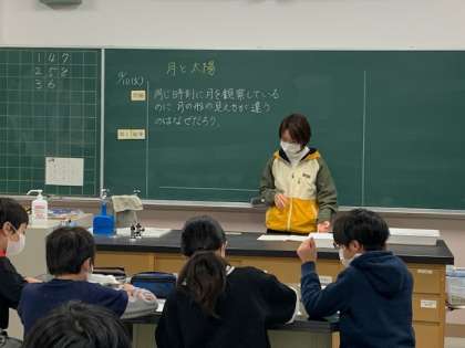 11月10日(火)1時間目、6年2組は理科で「月と太陽」という学習をしていました。同じ季節に同じ時刻に撮影した月の形が違うことから学習が始まりました。部屋を暗くし、月の模型にライトをあて実験を行い考えました。
