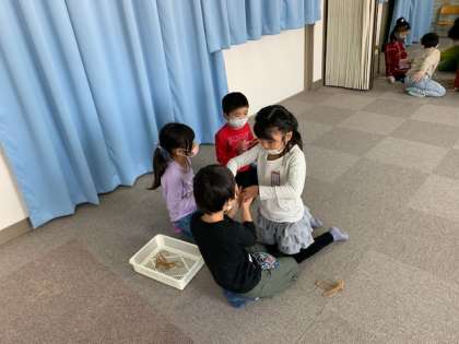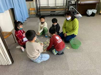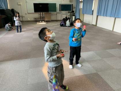 11月11日(水)1時間目、1年2組は生活科で「むかしあそび」をふれあいルームでしていました。あやとりをしたりかるたをしたり、こままわしをしたりしていました。「さんぽ」の曲に合わせて遊ぶものをグループで替えていきました。とても楽しそうでした。