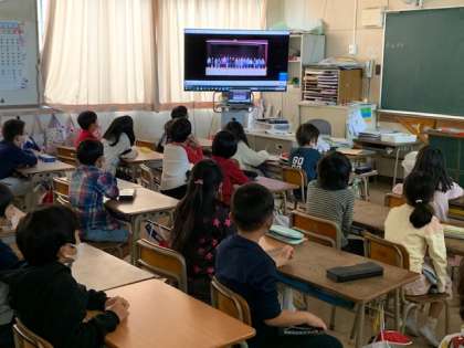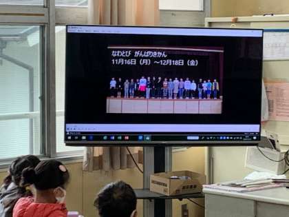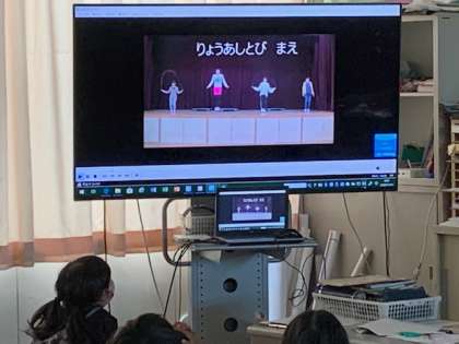 11月12日(木)今年度初めての児童集会がありました。新型コロナウイルス感染症の予防のために、体育館に全校児童が集まることをひかえていました。今日は、運動委員会の人がビデオを各学級に流しました。なわとびがんばり期間(11/16〜12/18)についての報告の後、なわとびの跳び方の紹介がありました。1年生からは、「(なわが)全然見えへん。」や「うわー。すげー。」や「あのお姉ちゃん、すごい!」等の声が多く聞こえました。最後は三重跳びの紹介でした。あこがれと、自分もがんばろうという気持ちが伝わってきました。新しい児童集会の形だと思いました。
