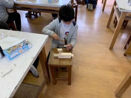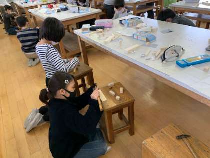 11月13日(金)2時間目、3年2組は図工室で釘うちをしていました。みんな真剣な表情でかなづちを握っていました。