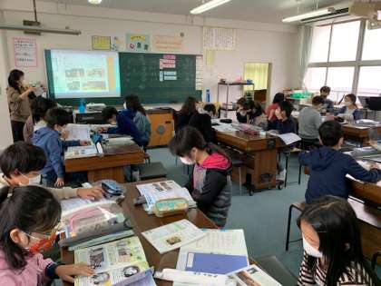 11月13日(金)2時間目、5年2組は音楽で「赤とんぼ」を聞いて声の種類を確かめていました。ソプラノ、アルト、テノール、バスの違いが分かったでしょうか?