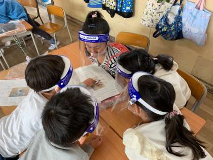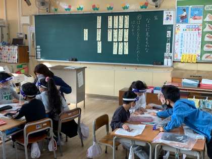 11月16日(月)1時間目、1年2組は「なにに見えるかな」の学習で、班の友達と見えたものを楽しく話す学習をしていました。
