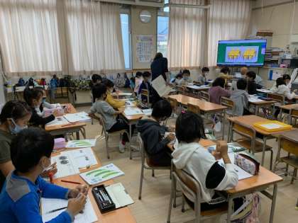 11月17日(火)1時間目、2年1組は算数でかけ算を使って数を求める方法を考えていました。大型モニターには、テーブルに6脚のいすがあり、そのテーブルが2台あるようすが映されていました。子どもたちはどのような式を立てたのでしょうか?