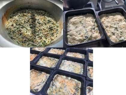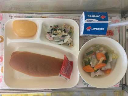 【スープ煮、ほうれんそうのグラタン、白桃(缶)、いちごジャム、コッペパン、牛乳】