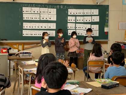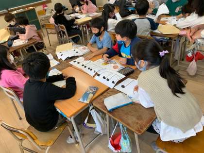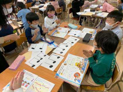 11月19日(木)2時間目、2年2組は音楽で「くりかえしを使って『おまつりの音楽』をつくろう」というめあてでグループで協力して音楽を作りました。子どもたちはとても楽しそうにグループで音楽を作り、練習していました。