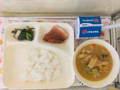 【あかうおのしょうゆだれかけ、みそ汁、こまつなのいためもの、ごはん、牛乳】
