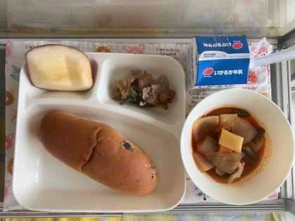 【豚肉のカレー風味焼き、ケチャップ煮、りんご、レーズンパン、牛乳】