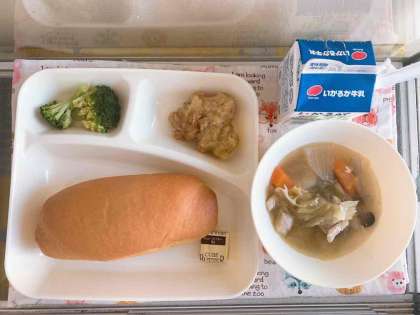【白身魚のフリッター、洋風煮、ブロッコリーのサラダ、コッペパン、バター、牛乳】