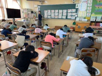 12月1日(火)5時間目、1年1組は学級活動で「ぬり絵大会」をしていました。ぬり絵を黒板に貼り、全員がしっかりと見た上で一番上手にぬれている絵に手をあげて一番を決めるようです。顔をふせて手をあげていました。だれのぬり絵に手が多く挙がったのでしょうね。