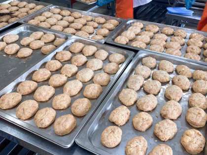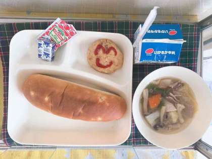 【とうふハンバーグ、カリフラワーのスープ煮、固形チーズ、おさつパン、牛乳】