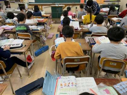 12月3日(木)4時間目、2年2組は音楽で鍵盤ハーモニカの練習をしていました。「山のポルカ」の指づかいを練習していました。