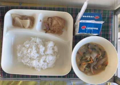 【鶏肉の甘辛焼き、みそ汁、だいこんの煮もの、ごはん、牛乳】