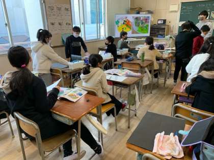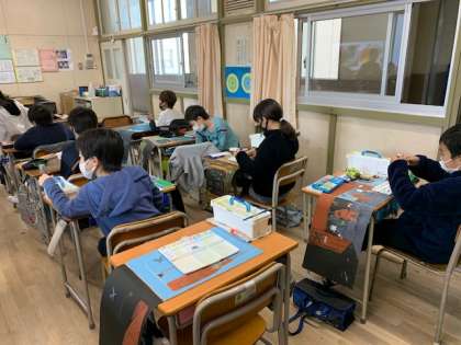 12月5日(土)1時間目、5年2組は図工で「ミラクルミラーステージ」を作り始めていました。約3分の1の人は一版多色刷りの仕上げをしていました。