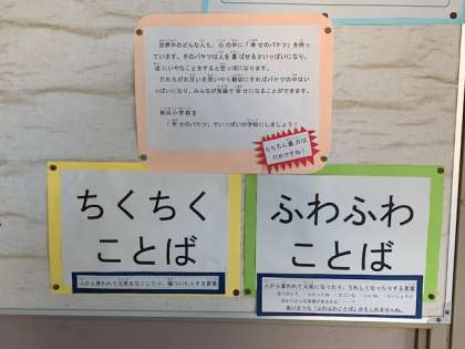 12月7日(月)児童朝会で「ふわふわ言葉」と「ちくちく言葉」のお話をしました。また、一人一人の心の中に「幸せのバケツ」があることも話しました。お話したことを校長室前に掲示しました。