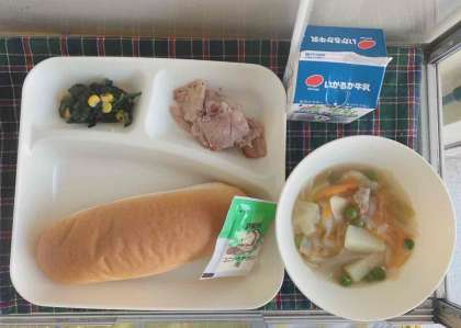 【豚肉のガーリック焼き、スープ、ほうれんそうのソテー、ソフトマーガリン、コッペパン、牛乳】