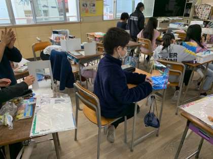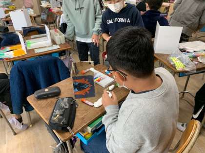 12月8日(火)1時間目、5年1組は図工でした。「ミラクルミラーステージ」の続きをしていました。直角に折り曲げた鏡の前にペンギンを2匹並べるだけで8匹に見えていました。その時「ミラクル」に意味が分かりました。一人一人工夫を凝らして作っていました。